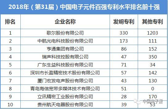 按照發(fā)明專利與其他專利2.5∶1的權重衡量本屆電子元件百強的專利水平,歌爾股份、中航光電和亨通集團三家公司跟前兩屆一樣,包攬了前三名。歌爾股份有限公司2017年獲得了330項發(fā)明專利和1203項其他專利,依然遠超諸強,連續(xù)三年授權專利數超千項,歌爾股份創(chuàng)造了電子元件百強的新紀錄。