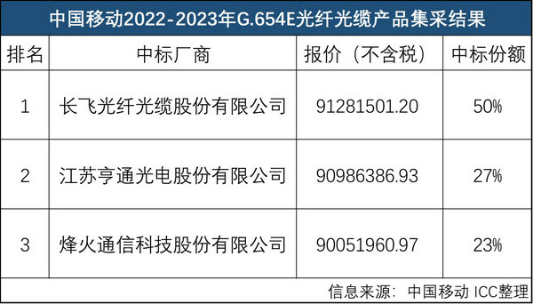 ICC訊 4月12日消息,中國移動公布2022-2023年G.654E光纖光纜產(chǎn)品集中采購項目中標(biāo)候選人結(jié)果,長飛、亨通和烽火成功中標(biāo),三家報價和中標(biāo)份額如下: