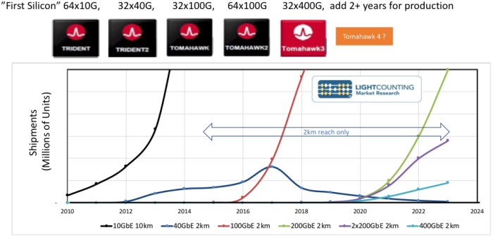 即使到2023年,100GbE(2公里)CWDM4和DR1模塊的出貨量還將持續(xù)增長。在基于Tomahawk3的交換機部署中,這些模塊能支持最高128端口基數(shù)--這是超大規(guī)模運營商的一個重要優(yōu)勢。