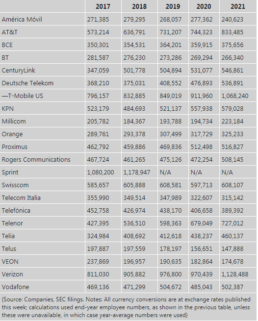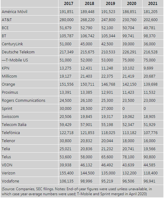 (Source: Companies, SEC filings. Notes: All currency conversions are at exchange rates published this week; operators include América Móvil, AT&T, BCE, BT, CenturyLink, Deutsche Telekom, KPN, Millicom, Orange, Proximus, Rogers Communications, Swisscom, Telecom Italia, Telefónica, Telenor, Telia, Telus, VEON, Verizon, Vodafone)