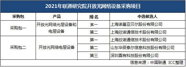 根據(jù)公告,本項目分為兩個采購包,分別為采購包一:開放光網(wǎng)絡光層設備和電層設備和采購包二:開放光網(wǎng)絡電層設備,中選廠商情況如下:
