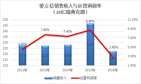 作為通信行業(yè)傳統(tǒng)勢(shì)力的代表,同是來(lái)自歐洲的愛(ài)立信和諾基亞之間的競(jìng)爭(zhēng)已經(jīng)持續(xù)了數(shù)十年,愛(ài)立信在運(yùn)營(yíng)商網(wǎng)絡(luò)業(yè)務(wù)領(lǐng)域的收入規(guī)模始終保持著對(duì)諾基亞的大幅度優(yōu)勢(shì),但隨著諾基亞完成與阿爾卡特-朗訊的合并,愛(ài)立信在2016年的營(yíng)收規(guī)模已被諾基亞所超越,但比規(guī)模優(yōu)勢(shì)喪失更令人擔(dān)憂的是,愛(ài)立信2016年的經(jīng)營(yíng)利潤(rùn)率只有2.8%,已經(jīng)跌到了近10年來(lái)的最低水平。
