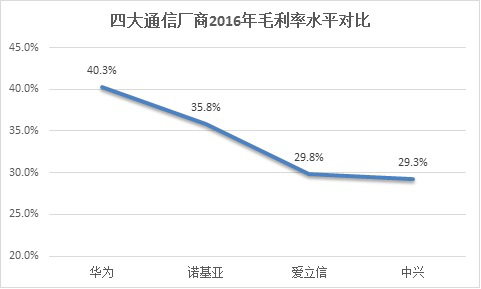 中興在2016年的整體銷(xiāo)售收入達(dá)到146億美元,但仍不足領(lǐng)頭羊華為的2成;在運(yùn)營(yíng)商業(yè)務(wù)領(lǐng)域,即使與增長(zhǎng)乏力的諾基亞和愛(ài)立信相比也只有對(duì)方的4成不到;因此,在彼此競(jìng)爭(zhēng)的業(yè)務(wù)領(lǐng)域,中興的營(yíng)收規(guī)模已經(jīng)遠(yuǎn)遠(yuǎn)落后與對(duì)手,成為四大通信廠商中的掉隊(duì)者。此外,從下圖所示四大通信廠商毛利率水平對(duì)比來(lái)看,中興毛利率水平排名墊底,在某種程度上也反映出公司生產(chǎn)成本受規(guī)模效應(yīng)的影響。