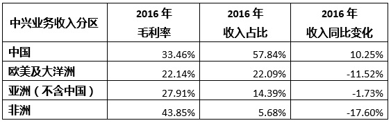 按照中興在2016年財(cái)報(bào)中所稱“本集團(tuán)堅(jiān)持人口大國(guó)和全球主流運(yùn)營(yíng)商戰(zhàn)略,并在部分區(qū)域取得新的突破,逐步重塑市場(chǎng)格局“的說(shuō)法,中興在海外市場(chǎng)布局上的收縮態(tài)勢(shì)明顯,按人民幣計(jì)算,2016年中興在非洲市場(chǎng)銷(xiāo)售同比下降了17.6%,歐美及大洋洲市場(chǎng)下降了11.5%,除中國(guó)外的亞洲市場(chǎng)下降了1.7。中興在海外市場(chǎng)布局上的收縮,與其海外業(yè)務(wù)盈利能力差有一定的聯(lián)系。如下表中興在不同區(qū)域市場(chǎng)的毛利率水平所見(jiàn),在發(fā)達(dá)的歐美及大洋洲市場(chǎng)和競(jìng)爭(zhēng)激烈的亞洲(不含中國(guó))市場(chǎng),中興的毛利率均遠(yuǎn)低于其國(guó)內(nèi)毛利率水平,這與中興一貫以低價(jià)沖擊發(fā)達(dá)市場(chǎng)的策略有關(guān),但同樣也反映出出其在海外市場(chǎng)競(jìng)爭(zhēng)實(shí)力弱和盈利能力差的特點(diǎn)。