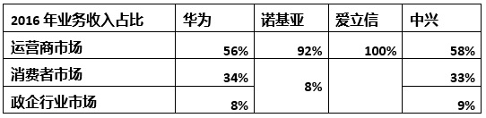 可以看出,在公司整體業(yè)務(wù)收入上,四大通信廠商在2016年的表現(xiàn)和排名相對(duì)2015年變化并不大:
