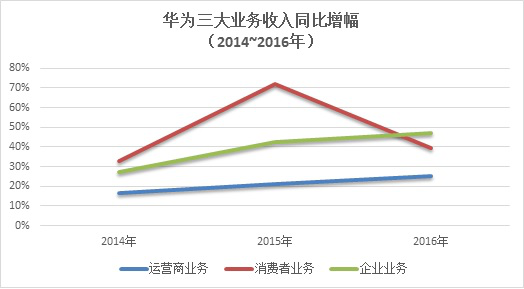 華為的整體銷(xiāo)售收入在2016年同比增長(zhǎng)了32%,這一增幅低于2015年的37%,體量更為龐大是一個(gè)原因,但其中最大的影響還是消費(fèi)者業(yè)務(wù)增速下降明顯:從下表所示華為三大業(yè)務(wù)在三年間的業(yè)務(wù)收入同比增幅來(lái)看,2015年消費(fèi)者業(yè)務(wù)收入同比增幅高達(dá)72%,對(duì)2015年整體收入增長(zhǎng)的貢獻(xiàn)率達(dá)到51%;而2016年的收入同比增幅已下降到44%,對(duì)2016年整體業(yè)務(wù)收入增長(zhǎng)的貢獻(xiàn)率也只有40%,低于運(yùn)營(yíng)商業(yè)務(wù)的貢獻(xiàn)率。