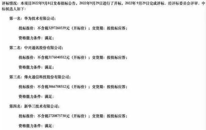 該項(xiàng)目2022年9月8日發(fā)布招標(biāo)公告,2022年9月29日進(jìn)行了開(kāi)標(biāo),2022年 9月29日完成評(píng)標(biāo),經(jīng)評(píng)標(biāo)委員會(huì)評(píng)審,華為以32.97億元的報(bào)價(jià)奪魁,中興、烽火、新華三報(bào)價(jià)分別為31.76億、30.67億、27.21億。