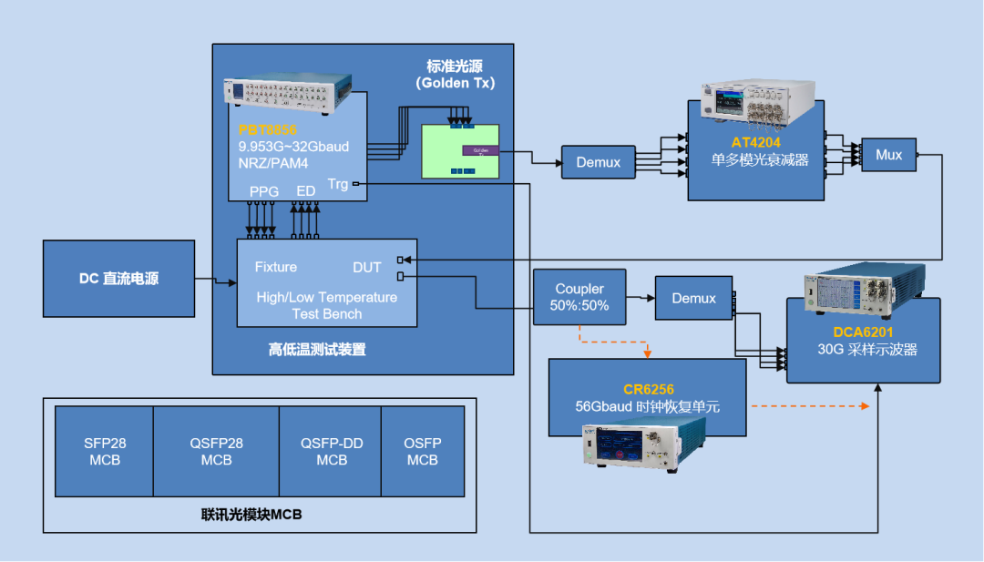 針對400G 光模塊,聯(lián)訊儀器提供一站式測試解決方案,包括8通道400G PAM4誤碼儀,56G波特率光時鐘恢復單元(支持NRZ/PAM4 時鐘恢復),1/2/4光口采樣示波器,多通道光衰減器,多通道光功率計,光開關等設備,以及光模塊的MCB,可根據(jù)客戶的實際使用環(huán)境靈活配置。