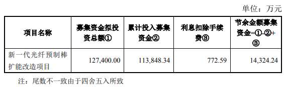 ICC訊 亨通光電新一代光纖預制棒擴能改造項目已完工,前期已分批轉(zhuǎn)為固定資產(chǎn)。為更好地發(fā)揮募集資金效益,提高資金使用效率,公司計劃將募投項目新一代光纖預制棒擴能改造項目的節(jié)余資金合計 14,324.24 萬元(實際金額以轉(zhuǎn)出 當日銀行結(jié)息余額為準)全部永久補充上市公司流動資金。