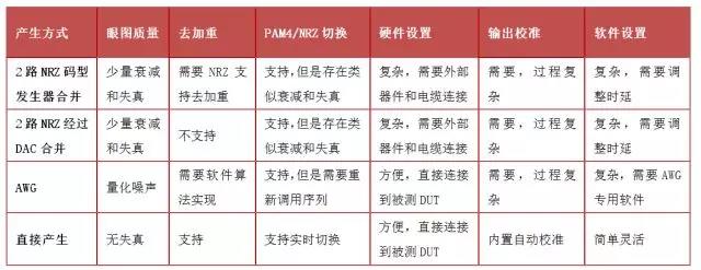 下面的表格總結(jié)了上述四種PAM4誤碼儀下信號產(chǎn)生的不同方式以及特點。
