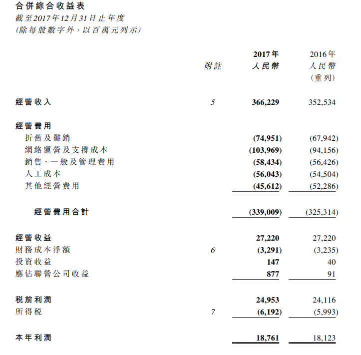 ICCSZ訊 (編輯:Jane)3月28日,中國電信公布了截止2017年全年的業(yè)績報告。報告顯示2017年,中國電信經(jīng)營收入到人民幣3,662億 元,同 比 增 長3.9%,公司股東應(yīng)占利潤達(dá)到人民幣186.17億元,比去年增長3.3%。其中服務(wù)收入達(dá)到人民幣3,310億元,同比增長6.9%,連續(xù)三年高于行業(yè)平均。移動服務(wù)收入達(dá)到人民幣1,538億 元,同 比 增 長11.7%,固網(wǎng)服務(wù)收入達(dá)到人民幣1,772億 元,同 比 增長3.0%,增幅雙雙提升;收入結(jié)構(gòu)進(jìn)一步優(yōu)化,新興業(yè)務(wù)收入占服務(wù)收入比較去年提升6.4個百分點。