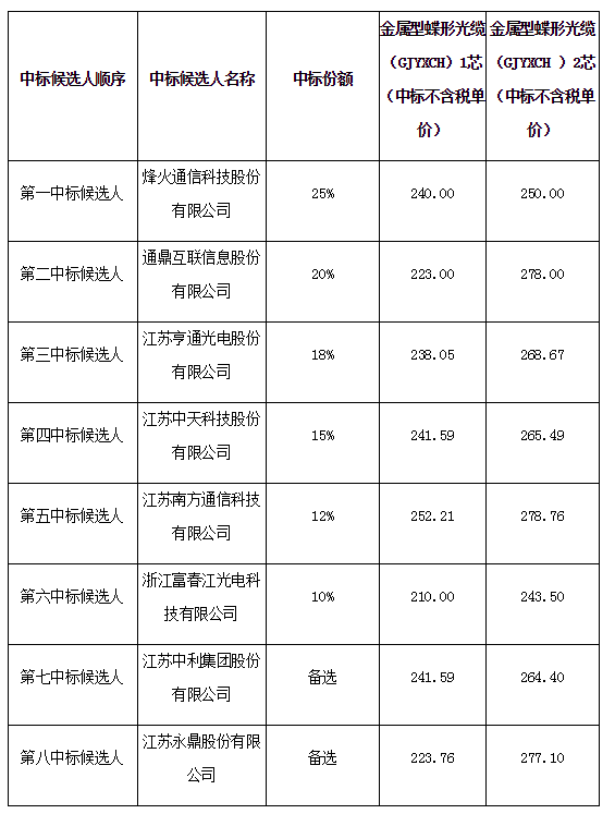 ICCSZ訊 (編輯:Nicole)四川移動開啟2019年室外金屬蝶型光纜采購項目中標候選人公示,共有烽火通信、通鼎互聯(lián)、亨通光電、中天科技、南方通信及富春江光電等6家光纜廠商中標。