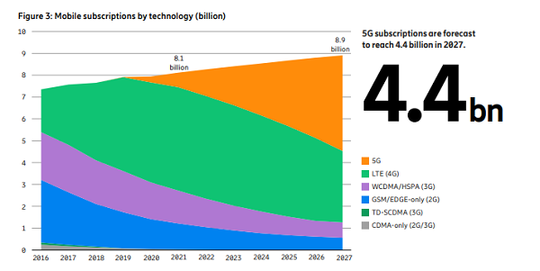 在愛立信移動(dòng)報(bào)告十周年紀(jì)念版中,這家瑞典設(shè)備商現(xiàn)在預(yù)測(cè)到2021年底,全球5G用戶將超過6.6億,到2027年底,全球5G用戶預(yù)計(jì)將達(dá)到44億。