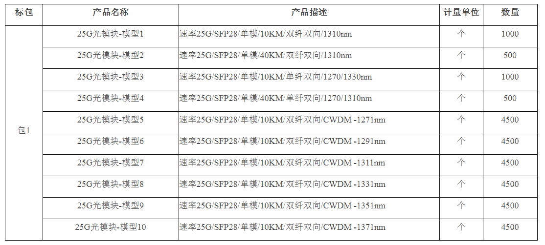 根據(jù)此前招標(biāo)公告顯示,該項(xiàng)目擬采購(gòu)25G光模塊總數(shù)量約30000塊,最高總預(yù)算6780萬(wàn)元(含稅),高于該限價(jià)的將否決投標(biāo)。中標(biāo)人數(shù)量為4個(gè),具體中標(biāo)份額對(duì)應(yīng)為:30%、27.5%、22.5%、20%。