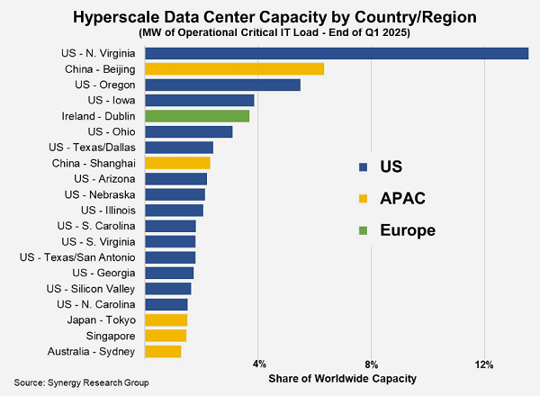 ICC訊 2025年7月16日,市場(chǎng)研究機(jī)構(gòu)Synergy發(fā)布數(shù)據(jù)顯示,全球超大規(guī)模數(shù)據(jù)中心產(chǎn)能的62%集中于20個(gè)州/都會(huì)區(qū)。其中美國(guó)弗吉尼亞北部和中國(guó)大北京地區(qū)獨(dú)占20%份額,緊隨其后的是美國(guó)俄勒岡州、愛(ài)荷華州、愛(ài)爾蘭都柏林、俄亥俄州、達(dá)拉斯和上海。在這份頂級(jí)榜單中,美國(guó)占據(jù)14席,亞太地區(qū)5席,歐洲僅存1席。排名20位之后的次一級(jí)市場(chǎng)貢獻(xiàn)了另外17%的產(chǎn)能,非美國(guó)地區(qū)在此梯隊(duì)中表現(xiàn)更為突出。阿姆斯特丹和法蘭克福曾位列前20,但近期已跌出榜單。