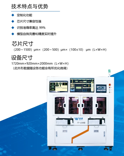 AOI 六面檢測(cè)設(shè)備采用了Al深度學(xué)習(xí)與傳統(tǒng)視覺(jué)相結(jié)合的方式來(lái)實(shí)現(xiàn)模型 自我完善和精度實(shí)時(shí)提升。識(shí)別精度:0.5um (0.1 um /pixel)可檢測(cè)多種缺陷類(lèi)別:裂紋、臟污、崩邊、鍍膜脫落、波導(dǎo)相似度、解離 紋、多料少料、劃傷、鍍膜不均、壓傷、波導(dǎo)工藝問(wèn)題、脫金、字符缺失、背 金不平整。為每一款芯片的每個(gè)面制作單獨(dú)模型,從而訓(xùn)練高精度的特征模 型,奠定了高識(shí)別準(zhǔn)確率的基礎(chǔ)。替代傳統(tǒng)的人工鏡檢環(huán)節(jié),降低人工成本, 提高了生產(chǎn)效率和穩(wěn)定性,減少人工依賴(lài)。