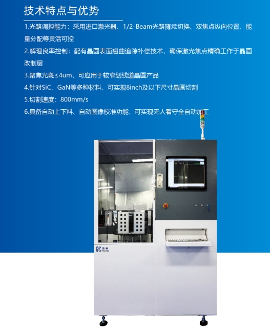 該設(shè)備主要對(duì)SiC、GaN 等第三代半導(dǎo)體材料的晶圓或Bar條進(jìn)行激光隱切,并且 后期可用于LED、LD、大功率等芯片。具有全自動(dòng)上下料功能,可用于數(shù)字化無(wú)人車(chē) 間。