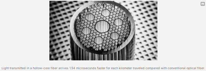 空芯光纖(HCF)是光纖介質(zhì)的下一個(gè)重大進(jìn)展,它通過(guò)空氣或真空而非玻璃來(lái)導(dǎo)引激光。簡(jiǎn)而言之,光在玻璃中的傳輸速度比在空心的管道(波導(dǎo))中慢,而且玻璃也限制了可用于數(shù)據(jù)傳輸?shù)墓忸l數(shù)量。如果將單模光纖比作標(biāo)準(zhǔn)高速公路,那么空芯光纖就是高速公路,它能降低延遲、增加當(dāng)前傳輸距離,并具有未來(lái)進(jìn)一步提升速度的潛力。