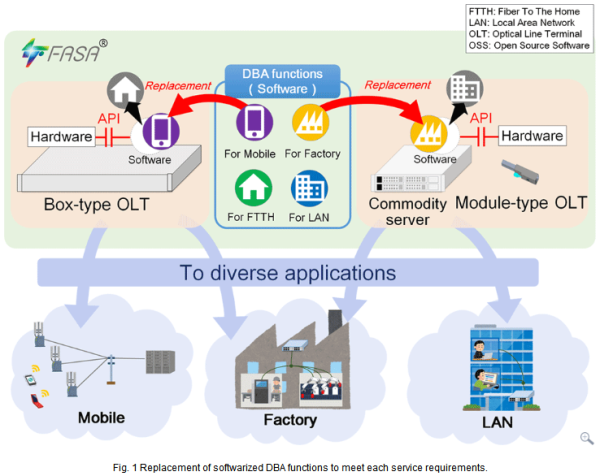 2016年2月,NTT為未來接入網(wǎng)絡(luò)的技術(shù)發(fā)展提出了 FASA (靈活接入系統(tǒng)架構(gòu))概念。FASA 并不利用一般的專用設(shè)備,而是盡可能多地對(duì)接入設(shè)備中的各項(xiàng)單獨(dú)功能加以模塊化,從而支持對(duì)這些單個(gè)組件進(jìn)行自由結(jié)合。這將讓各項(xiàng)功能以服務(wù)所要求的低成本和靈活性,被構(gòu)建入接入設(shè)備之中,同時(shí)又能繼續(xù)保持同樣的服務(wù)品質(zhì)。關(guān)于這種在接入設(shè)備上進(jìn)行部署的模塊化技術(shù)的創(chuàng)新概念可以說是全球首創(chuàng)。