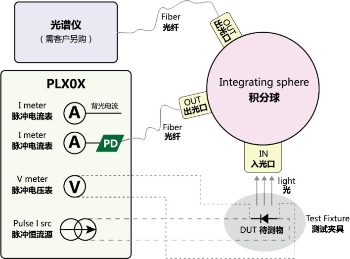 PL系列窄脈沖LIV測試系統(tǒng)由PL系列脈沖恒流源、測試夾具、積分球、光纖、光譜儀等組成。測試原理LIV測試采用對激光器脈沖電流供電,測量器件兩端電壓和器件輸出光功率。LIV測試系統(tǒng)作為精密的電流脈沖源,驅(qū)動激光器發(fā)出不同波長的激光,激光經(jīng)過特制的積分球來進(jìn)行收光,積分球?qū)⒕哂幸欢òl(fā)散角的光進(jìn)行能量衰減,然后使用PD進(jìn)行光電轉(zhuǎn)換,系統(tǒng)對光電流進(jìn)行快速采樣,從而達(dá)到精準(zhǔn)測算激光器所輸出的激光功率。經(jīng)典的測試原理配合普賽斯PL測試系統(tǒng)出色的性能和嚴(yán)格的指標(biāo)要求,幫助行業(yè)用戶完成了一系列富有挑戰(zhàn)的測試項(xiàng)目。