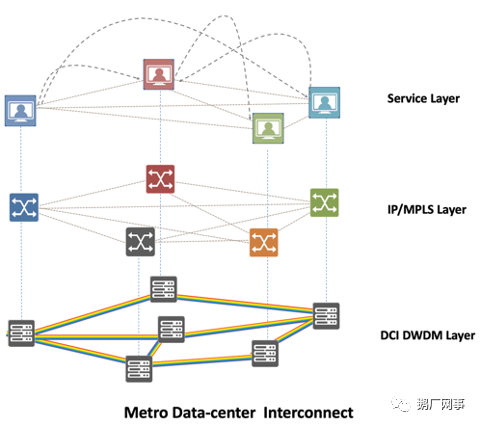 同時(shí),我們注意到在數(shù)據(jù)中心互聯(lián)場景應(yīng)用中,如上圖所示,波分系統(tǒng)在數(shù)據(jù)中心網(wǎng)絡(luò)結(jié)構(gòu)中位于最底層,提供節(jié)點(diǎn)間的互聯(lián)。單個(gè)網(wǎng)絡(luò)平面內(nèi),IP設(shè)備可以是多供應(yīng)商來源混合部署,即不同節(jié)點(diǎn)的IP設(shè)備可以是來自于不同供應(yīng)商。波分設(shè)備通常每個(gè)平面采用單一供應(yīng)商進(jìn)行組網(wǎng),波分系統(tǒng)長期以來處于一個(gè)相對封閉的系統(tǒng)。一個(gè)平面全部為單一來源時(shí),當(dāng)發(fā)生供應(yīng)商風(fēng)險(xiǎn)時(shí),運(yùn)營團(tuán)隊(duì)將面臨十分棘手的狀態(tài)。TOOP也正是基于這樣的原因而誕生,為降低數(shù)據(jù)中心互聯(lián)這一類用戶的運(yùn)營復(fù)雜度與提高系統(tǒng)健壯性的痛點(diǎn)而生。