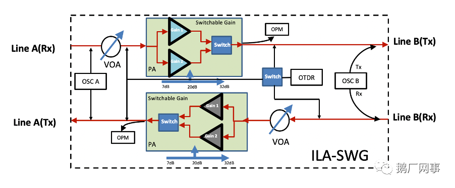 以線路放大器單板ILA-SWG為例,一塊單板相當(dāng)于傳統(tǒng)設(shè)備5塊業(yè)務(wù)單板的功能。OPC-4的OA-SWG單板內(nèi)置2塊高性能OCM、OTDR、OSC、VOA、無緣濾波器、雙向的PA單元。每一個(gè)器件在傳統(tǒng)設(shè)備中都是單獨(dú)以板卡形態(tài)存在。以BA/PA為例,我們選用了高功率Switchable gain EDFA,輸出功率高達(dá)23dBm,增益范圍支持7~32dB可調(diào)節(jié),其中平坦增益段支持15~30dB可調(diào)(NF < 6.5),這個(gè)噪聲系數(shù)是EDFA單板的噪聲系數(shù),相當(dāng)于傳統(tǒng)設(shè)備的一個(gè)光方向的噪聲系數(shù)。
