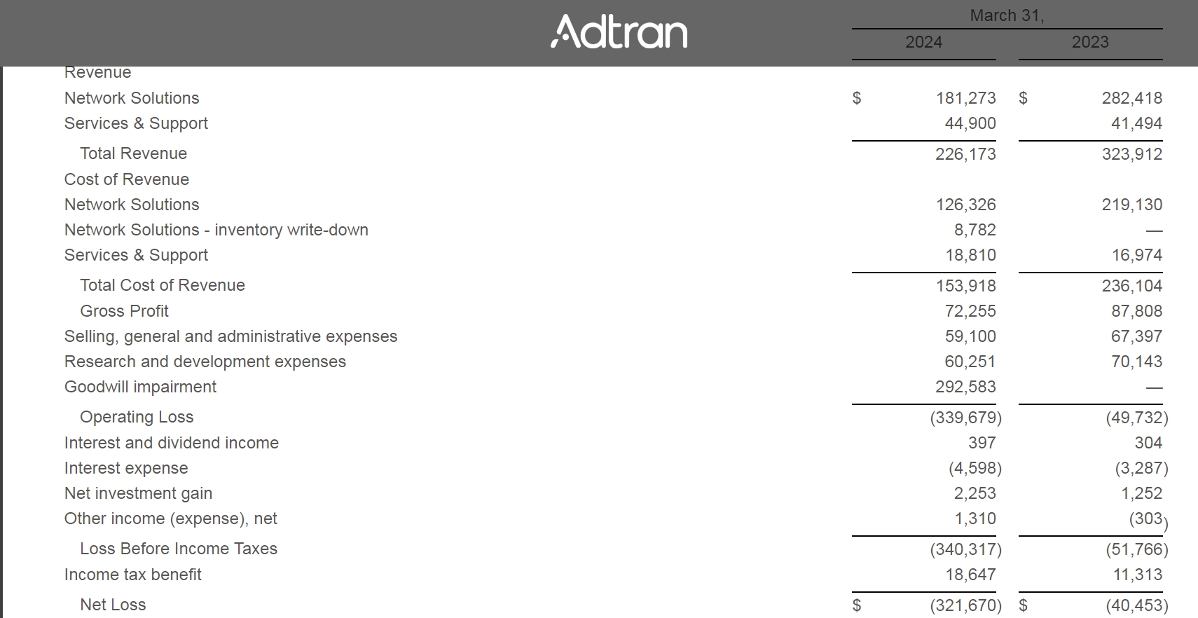 2024年第一季度,ADTRAN營收2.26億美元,去年同期為3.24億美元,同比下滑30.17%。該季度毛利率為31.95%,上個(gè)季度為34.8%,去年同期為27.1%。與去年同期相比,毛利率改善的主要原因是采購和運(yùn)輸成本降低,以及與收購有關(guān)的費(fèi)用、攤銷和調(diào)整減少。環(huán)比利潤率下降主要是由于880萬美元的庫存費(fèi)用,這與ADTRAN的業(yè)務(wù)效率計(jì)劃的戰(zhàn)略轉(zhuǎn)變有關(guān)。2024年第一季度凈虧損(包括上述減值費(fèi)用)為3.22億美元。第一季度攤薄每股虧損為4.12美元。
