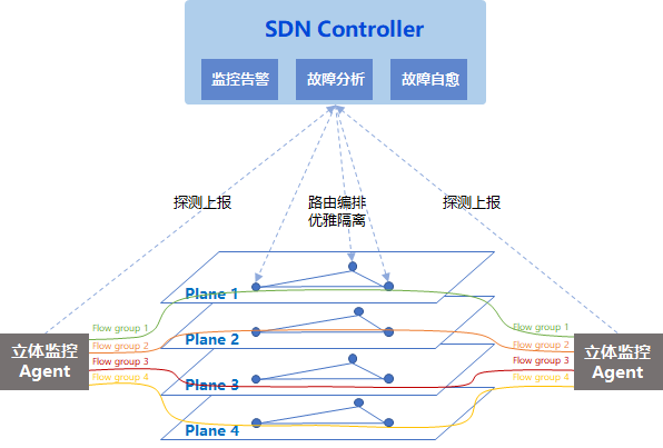 故障自愈,實(shí)現(xiàn)極簡運(yùn)維立體監(jiān)控。基于管理面的fullmesh監(jiān)控,通過控制器實(shí)現(xiàn)軟件定義探測流、編排探測路由的方式覆蓋到每一個(gè)網(wǎng)絡(luò)平面、每一臺(tái)設(shè)備甚至每一條鏈路,實(shí)現(xiàn)了端到端全方位的立體監(jiān)控,當(dāng)網(wǎng)絡(luò)出現(xiàn)丟包或時(shí)延變大等異常時(shí),立體監(jiān)控會(huì)立刻感知并上報(bào)告警,實(shí)現(xiàn)秒級(jí)的故障發(fā)現(xiàn)與精準(zhǔn)的故障定位;