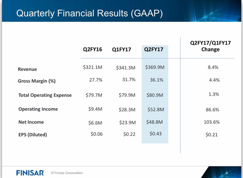 Finisar展望其Q317表現(xiàn),預(yù)計(jì)營收額在3.78億-3.98億元間,毛利率37%-38%,營業(yè)利潤18.5%-19.5%,EPS為0.58元-0.64元。