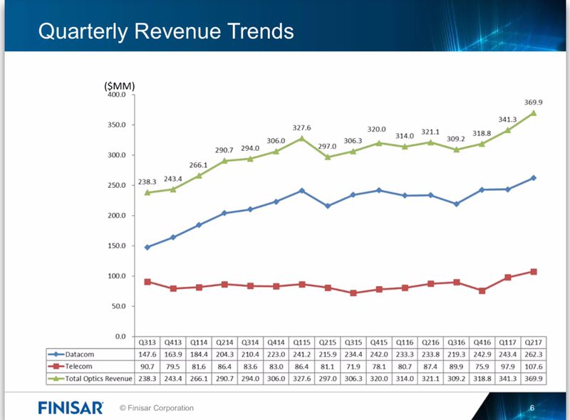 Iccsz訊 美國時間12月8日,Finisar公布了其截至2016年10月底的Q217業(yè)績數(shù)據(jù)。報告期內(nèi)Finisar營收3.7億美元,同比增長15.2%,環(huán)比增長8.4%,營收增加2850萬元,超過原有預(yù)期。其中電信部門營收1.07億元,同比增長23.1%,環(huán)比增長9.9%,營收增加970萬元;數(shù)通部門營收,環(huán)比增長7.7%,增加1880萬元。