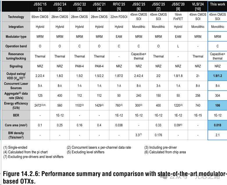 將發(fā)射機(jī)芯片的性能與其他工作進(jìn)行比較,實(shí)現(xiàn)2.1Tb/s/mm2 帶寬密度。所提出的 OTX 與傳統(tǒng)方法相比具有更高能效,得益于所提出的調(diào)制器驅(qū)動器拓?fù)浣Y(jié)構(gòu)(省去電平轉(zhuǎn)換器和 2xVDD 電源),以及近零靜態(tài)功耗的電容式 MRM 調(diào)諧。