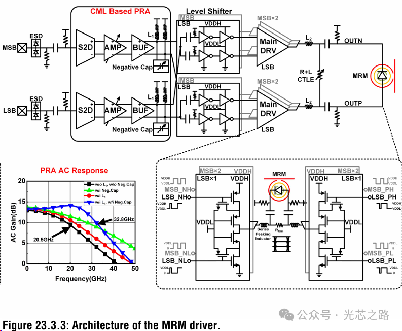如圖左上角所示,調(diào)制器驅(qū)動和前置驅(qū)動的原理圖,MRM pn 結(jié)上的反偏電壓可以獨(dú)立設(shè)置。