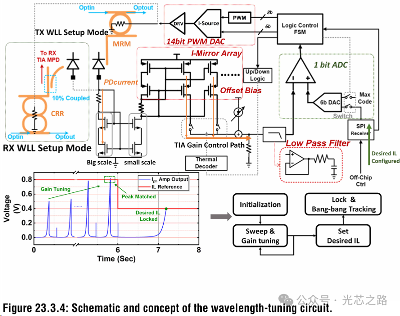在前端,設(shè)計(jì)一個(gè) MPD 電流(Iph)放大器,由一個(gè) 6b 數(shù)字信號自動調(diào)節(jié),以調(diào)節(jié) Iph 增益,從而消除 WDM 系統(tǒng)中通道之間的不匹配,并處理輸入光功率的變化以及系統(tǒng)光路徑損耗的變化,以確保Iph 與電路動態(tài)輸入范圍的最佳匹配。電路通過調(diào)整微環(huán)來精確地將波長鎖定到目標(biāo) IL 點(diǎn),使 Iph 結(jié)果的電壓與 VIL 相匹配。