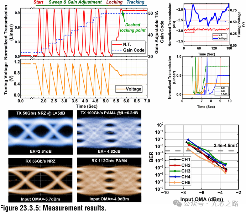 展示W(wǎng)LL的系統(tǒng)復(fù)位后 SWEEP & ADJUST 模式,鎖定和逐點(diǎn)熱調(diào)諧過程。通過設(shè)置不同的 IL 點(diǎn),微環(huán)共振可以鎖定到不同的 IL 值。在約 40°C 的環(huán)境熱擾動下,熱穩(wěn)定性能得到驗(yàn)證。測量得到的熱調(diào)諧效率為 TX MRM 為 0.3nm/mW,CRR 為 0.42nm/mW。整個(gè) WLL 電路的總功耗為 26.7mW,控制部分僅消耗 7.9mW。