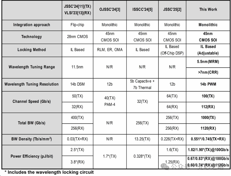 與先前報(bào)道的單片集成 MRM TRX 的性能比較,這項(xiàng)工作實(shí)現(xiàn)最高的單通道數(shù)據(jù)速率 100Gb/s 和最低能效2.5pJ/b。