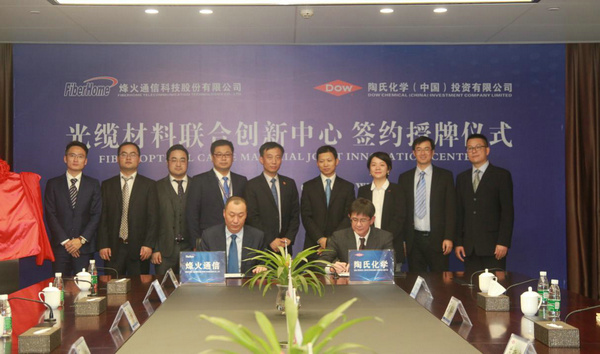 2018年10月23日,陶氏化學(xué)(中國)投資有限公司與烽火通信科技股份有限公司于武漢烽火科技園舉行光纜材料聯(lián)合創(chuàng)新中心授牌儀式并簽署諒解備忘錄。陶氏化學(xué)電線電纜業(yè)務(wù)亞太區(qū)銷售總監(jiān)蘇哲宏與烽火通信科技股份有限公司副總裁王彥亮分別代表雙方簽署諒解備忘錄并致辭。