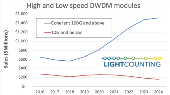 如果DWDM模塊的商用市場包括所有端口,2020年100G+相干模塊的銷售額將從8.1億美元上升至35億美元。