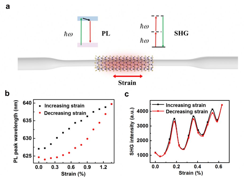 單層WS2由于中心反演對(duì)稱破缺,產(chǎn)生較強(qiáng)的二階非線性,他們通過波導(dǎo)結(jié)構(gòu)的設(shè)計(jì),實(shí)現(xiàn)了近紅外光泵浦的二次諧波轉(zhuǎn)換效率比裸光纖提高了約20倍。進(jìn)一步,他們在實(shí)驗(yàn)上首次展示了應(yīng)變調(diào)控的WS2-微納光纖器件的性能,實(shí)現(xiàn)了波導(dǎo)耦合的WS2激子光吸收、光發(fā)射波長的動(dòng)態(tài)改變,以及二次諧波轉(zhuǎn)換效率的切換。這種設(shè)計(jì)和調(diào)控策略可以推廣到其它二維材料體系,為微納光纖波導(dǎo)集成二維材料的高性能、可調(diào)諧的光電子器件的開發(fā)提供新的思路。