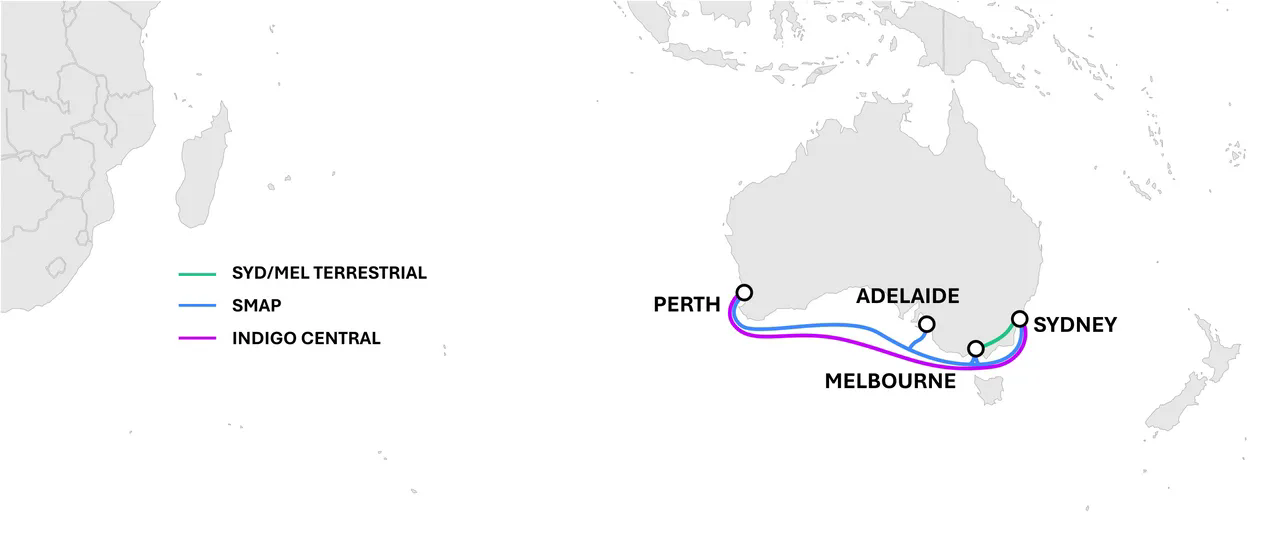 例如在悉尼-珀斯走廊上,Indigo Central和SMAP也提供了兩條完全獨(dú)立的海底光纜路由,具有不同的地理覆蓋,實(shí)現(xiàn)了真正的東-西向多樣化。兩者共同通過(guò)獨(dú)立的光纜登陸站、海底線(xiàn)路終端設(shè)備(SLTE)和數(shù)據(jù)中心提供增強(qiáng)的韌性,確保悉尼與珀斯之間具備強(qiáng)有力的路由分離能力,并防范單點(diǎn)故障風(fēng)險(xiǎn)。