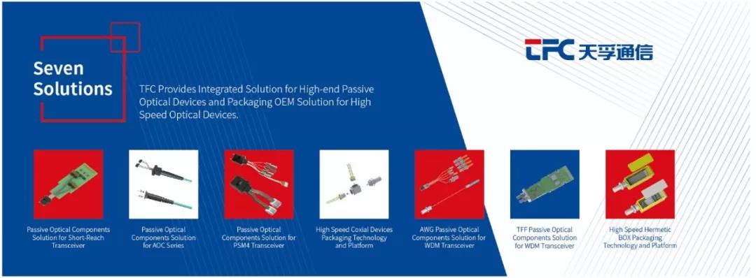 天孚通信將全方位展示為光模塊客戶提供的七大高端無源器件整體方案和高速光器件封裝OEM方案,包括SR系列,AOC系列,AWG WDM系列,TFF WDM系列,PSM4系列,高速率BOX封裝系列,以及高速率同軸封裝系列。