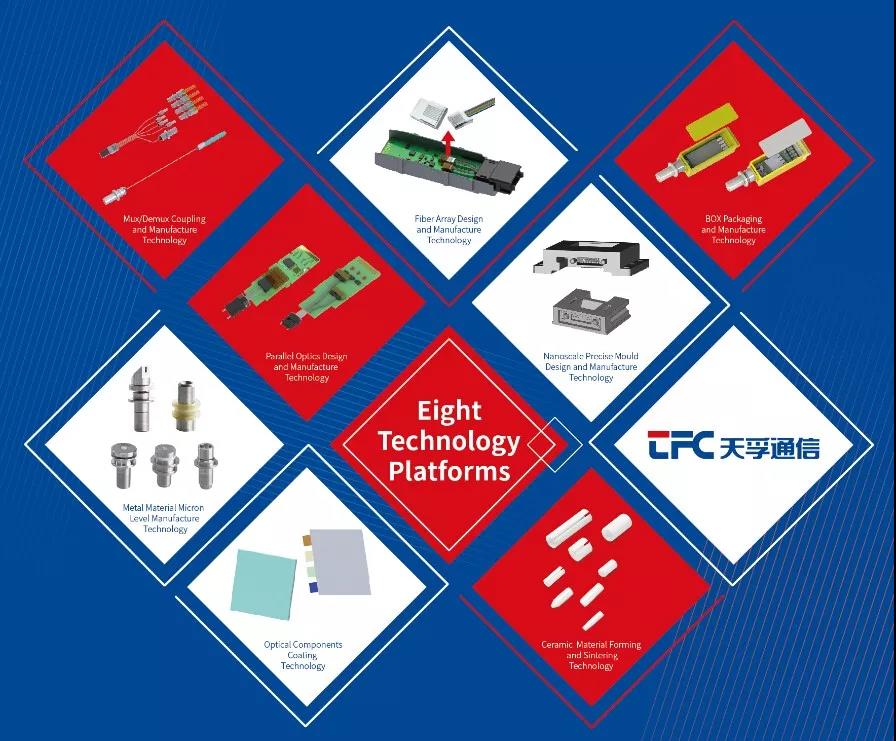 天孚通信將在展會上展示Mux/Demux耦合制造技術(shù)、FA光纖陣列設(shè)計制造技術(shù)、BOX封裝制造技術(shù)、并行光學(xué)設(shè)計制造技術(shù)、納米級精密模具設(shè)計制造技術(shù)、光學(xué)元件鍍膜技術(shù)、金屬材料微米級制造技術(shù)、陶瓷材料成型燒結(jié)技術(shù)八大核心技術(shù)平臺。