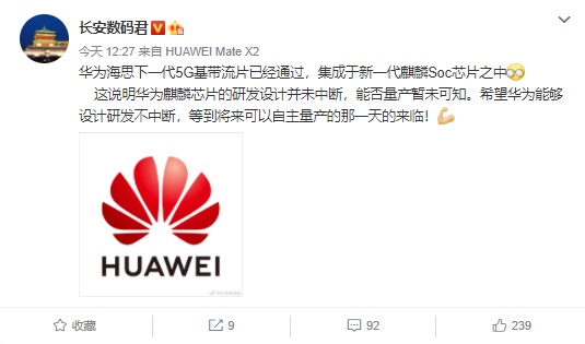 ICC訊 來自嗶哩嗶哩的一位華為工作人員 @秋葉梓洛(人送外號狐貍姐)透露,新一代海思 5G 基帶試流片已完成,新基帶并非獨立而是集成于新一代麒麟 Soc 芯片之中。