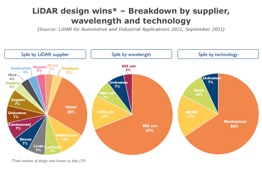 在LiDAR波長(zhǎng)方面,相比于905nm,1550nm被公認(rèn)為對(duì)人眼安全具有更小的危害,并且有望集成在硅平臺(tái)上。但是,905nm的設(shè)計(jì)方案仍然在汽車(chē)領(lǐng)域占比達(dá)到65%,在成像、傳統(tǒng)機(jī)械掃描領(lǐng)域占比達(dá)到69%。