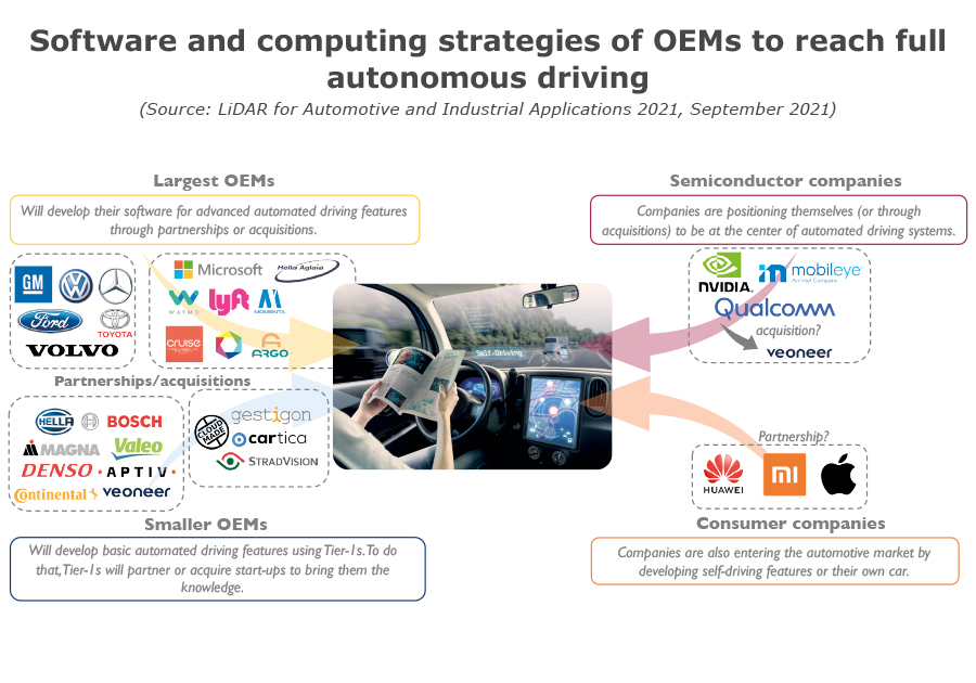 自動(dòng)駕駛的發(fā)展自然會(huì)吸引OEM制造商和Tier-1供應(yīng)商的注意。來(lái)自半導(dǎo)體或消費(fèi)行業(yè)的其他公司也將加入賽道競(jìng)爭(zhēng)。在這場(chǎng)完全自獨(dú)立的競(jìng)爭(zhēng)中,像大眾汽車(chē)這類(lèi)擁有龐大資源的大型OEM制造商將會(huì)自行開(kāi)發(fā)必要的軟件、合作或收購(gòu)機(jī)器人汽車(chē)公司,而資源相對(duì)較少的OEM制造商則會(huì)依賴(lài)Tier-1供應(yīng)商的支持以開(kāi)發(fā)基礎(chǔ)的自動(dòng)駕駛功能。這些Tier-1供應(yīng)商也必須具備攝像頭、雷達(dá)、LiDAR傳感器和計(jì)算機(jī)能力。諸如高通、英偉達(dá)或Intel-Mobileye等半導(dǎo)體領(lǐng)域廠商通過(guò)投入技術(shù)研發(fā)或者收購(gòu),正在將自己定位成自動(dòng)駕駛系統(tǒng)的核心。高通可能很快會(huì)收購(gòu)Veoneer以鞏固其在汽車(chē)行業(yè)的地位。來(lái)自消費(fèi)者行業(yè)的蘋(píng)果、華為或者小米公司也進(jìn)入了LiDAR市場(chǎng),根據(jù)他們的戰(zhàn)略,他們只需要開(kāi)發(fā)自動(dòng)駕駛中的部分板塊,或者是開(kāi)發(fā)屬于自己的汽車(chē),就像華為正在做的那樣。