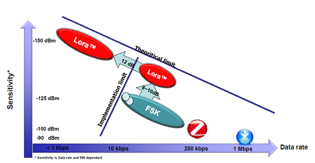 LoRa的誕生比NB-IoT要早些,2013年8月,Semtech公司向業(yè)界發(fā)布了一種新型的基于1GHz以下的超長(zhǎng)距低功耗數(shù)據(jù)傳輸技術(shù)(Long Range,簡(jiǎn)稱LoRa)的芯片。其接受靈敏度達(dá)到了驚人的-148dbm,與業(yè)界其他先進(jìn)水平的sub-GHz芯片相比,最高的接收靈敏度改善了20db以上,這確保了網(wǎng)絡(luò)連接可靠性。