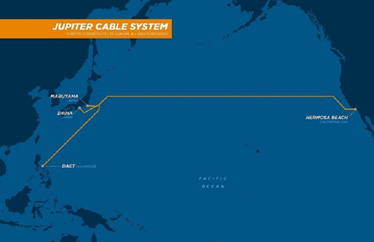 JUPITER海底光纜系統(tǒng)是由菲律賓長途電話公司PLDT、日本電報電話公司NTT、香港電訊盈科國際PCCW Global、軟銀、臉書Facebook和亞馬遜Amazon這六大企業(yè)組成的聯合體共同出資建設,全長接近14000千米,連接日本、菲律賓和美國,總容量超過60Tbps。