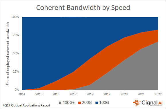 Cignal AI的首席分析師Andrew Schmitt表示:“相干400G將在2020年前限制現(xiàn)有的200G和100G技術(shù)發(fā)展,因為新設(shè)備將實現(xiàn)光容量的最大化,而不依賴于與覆蓋范圍。緊湊型模塊設(shè)備是一個支持平臺,到2017年翻了兩番,而且我們預(yù)計到2022年將會繼續(xù)增長至少40%。”
