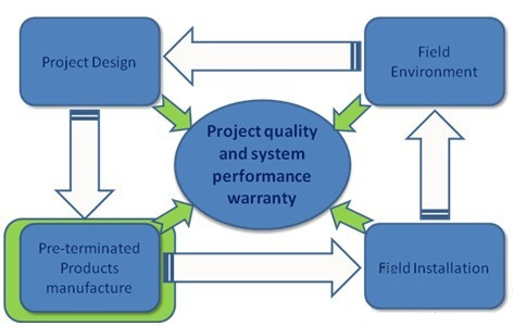 那么如何做好一個(gè)的MPO/MTP高密度光纖預(yù)連接系統(tǒng)項(xiàng)目呢?當(dāng)然要選擇高性能的。不過(guò)筆者多年來(lái)一直強(qiáng)調(diào)一個(gè)布線工程項(xiàng)目的性能取決于四大要數(shù):即前期設(shè)計(jì),產(chǎn)品性能,安裝工藝以及項(xiàng)目環(huán)境。在一個(gè)傳統(tǒng)的非預(yù)連接的布線系統(tǒng)項(xiàng)目中,四個(gè)要素對(duì)項(xiàng)目最終性能的影響基本上可以按各占25%來(lái)思考。但在預(yù)連接系統(tǒng)中這個(gè)比例就會(huì)發(fā)生很大變化,由于項(xiàng)目中大量現(xiàn)場(chǎng)的安裝,端接工作轉(zhuǎn)移都到前期的預(yù)連接產(chǎn)品上來(lái)。同時(shí)設(shè)計(jì)階段的長(zhǎng)度計(jì)算的結(jié)果也會(huì)在工廠得以落實(shí),因此說(shuō)預(yù)連接產(chǎn)品的性能對(duì)項(xiàng)目的最終性能會(huì)占到50%以上也不為過(guò)。這樣的狀況會(huì)使得在預(yù)連接工廠的工作就會(huì)變得更加關(guān)鍵。