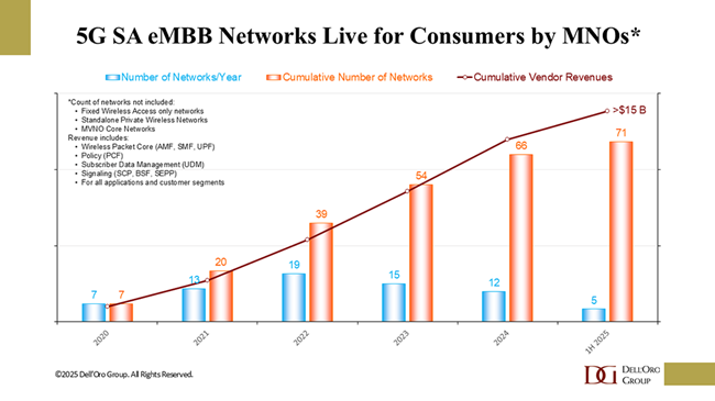 ICC訊  (作者:Dave Bolan)根據(jù)我們2025年第二季度移動核心網(wǎng)和多接入邊緣計算報告估算,5G核心網(wǎng)供應(yīng)商的制造收入實現(xiàn)了同比增長百分之三十一。同時,我們宣布全球已有71家移動運營商向消費者商業(yè)推出了增強型移動寬帶服務(wù)。