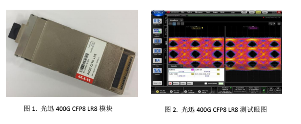 為了滿足市場需要,光迅公司推出400G CFP8 LR8模塊(圖1),該產(chǎn)品也是光迅公司針對(duì)400G客戶側(cè)應(yīng)用首推的產(chǎn)品,利用光迅公司現(xiàn)有的高端產(chǎn)品研發(fā)技術(shù)和100G集成器件封裝平臺(tái),能同時(shí)支持16x25.78125Gb/s NRZ和16x26.5625Gb/s NRZ傳輸并合成8路PAM4調(diào)制模式,完全滿足IEEE 802.3bs和400GBase-LR8/FR8標(biāo)準(zhǔn),最遠(yuǎn)支持10公里傳輸,在實(shí)驗(yàn)室測試眼圖性能良好(圖2);傳10km纖靈敏度高,展現(xiàn)優(yōu)秀的傳輸能力。